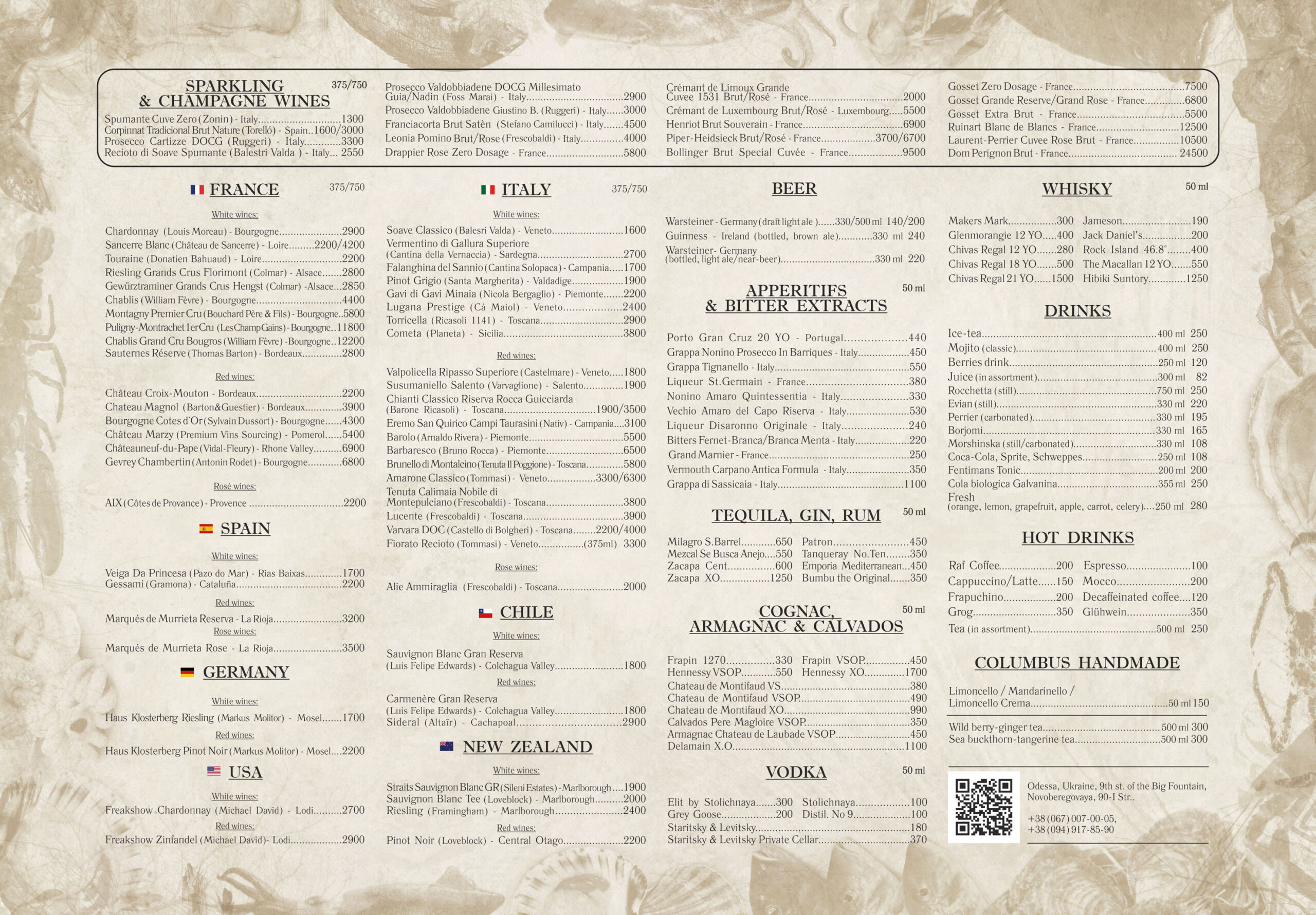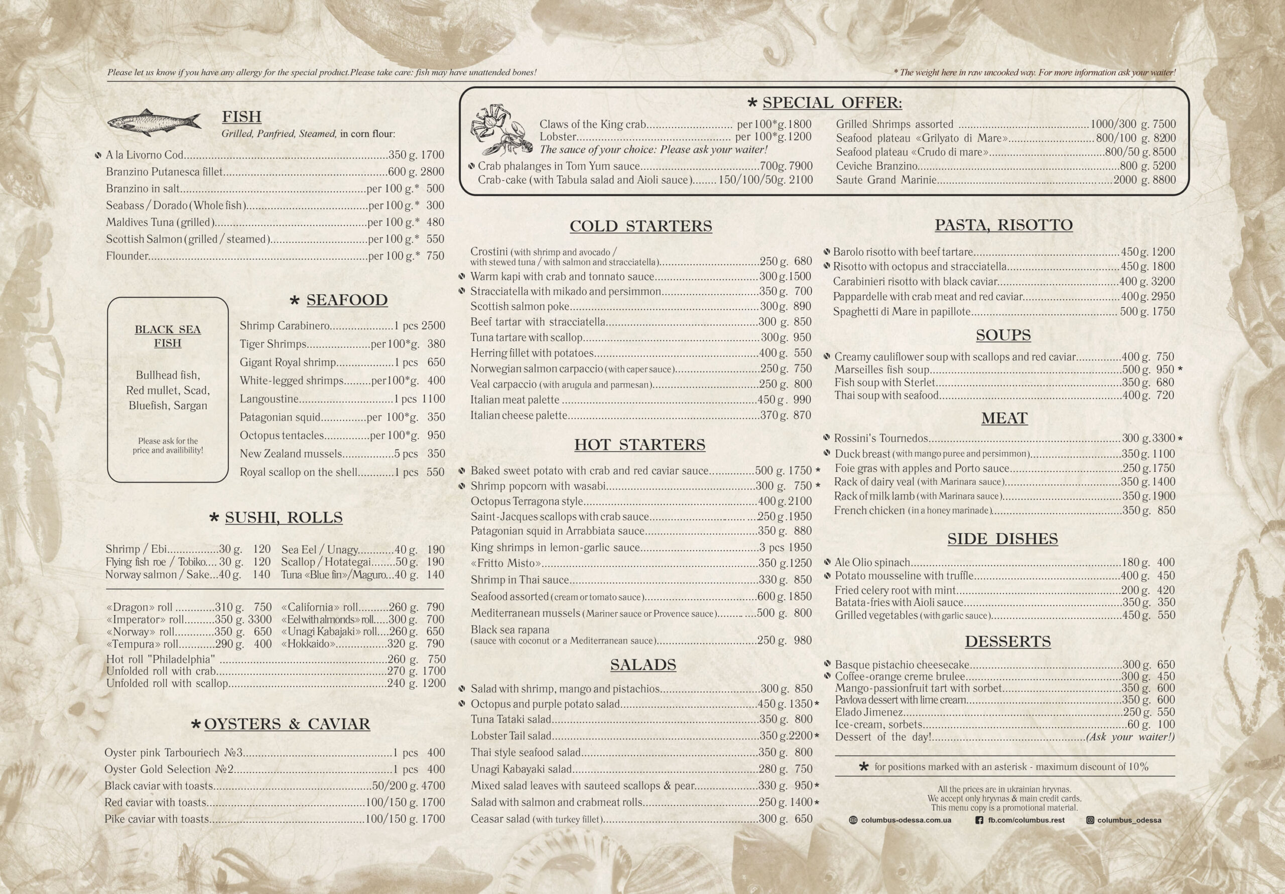 The basis of the Columbus fish-club menu is fish and seafood, but the menu changes from season to season: meat, grilled dishes, cold and hot snacks, desserts join the fish. The same can be said about the belonging of the restaurant's cuisine to any territory or country. Yes, this is mainly seafood, but the sea takes up most of the planet, and the chef has a huge field for activity, quite stylishly mixing Mediterranean, Japanese, Thai, Scandinavian dishes in one menu.
