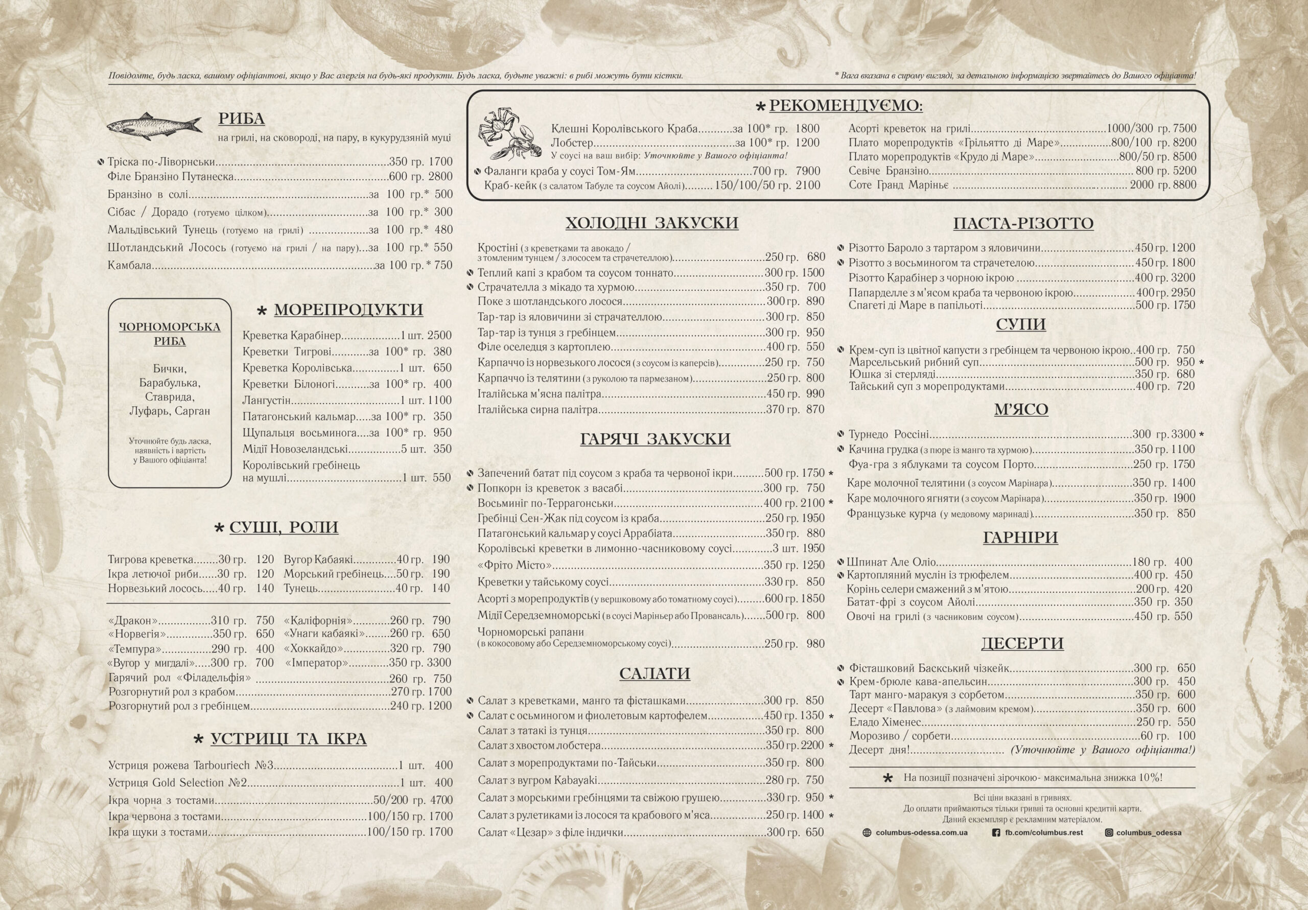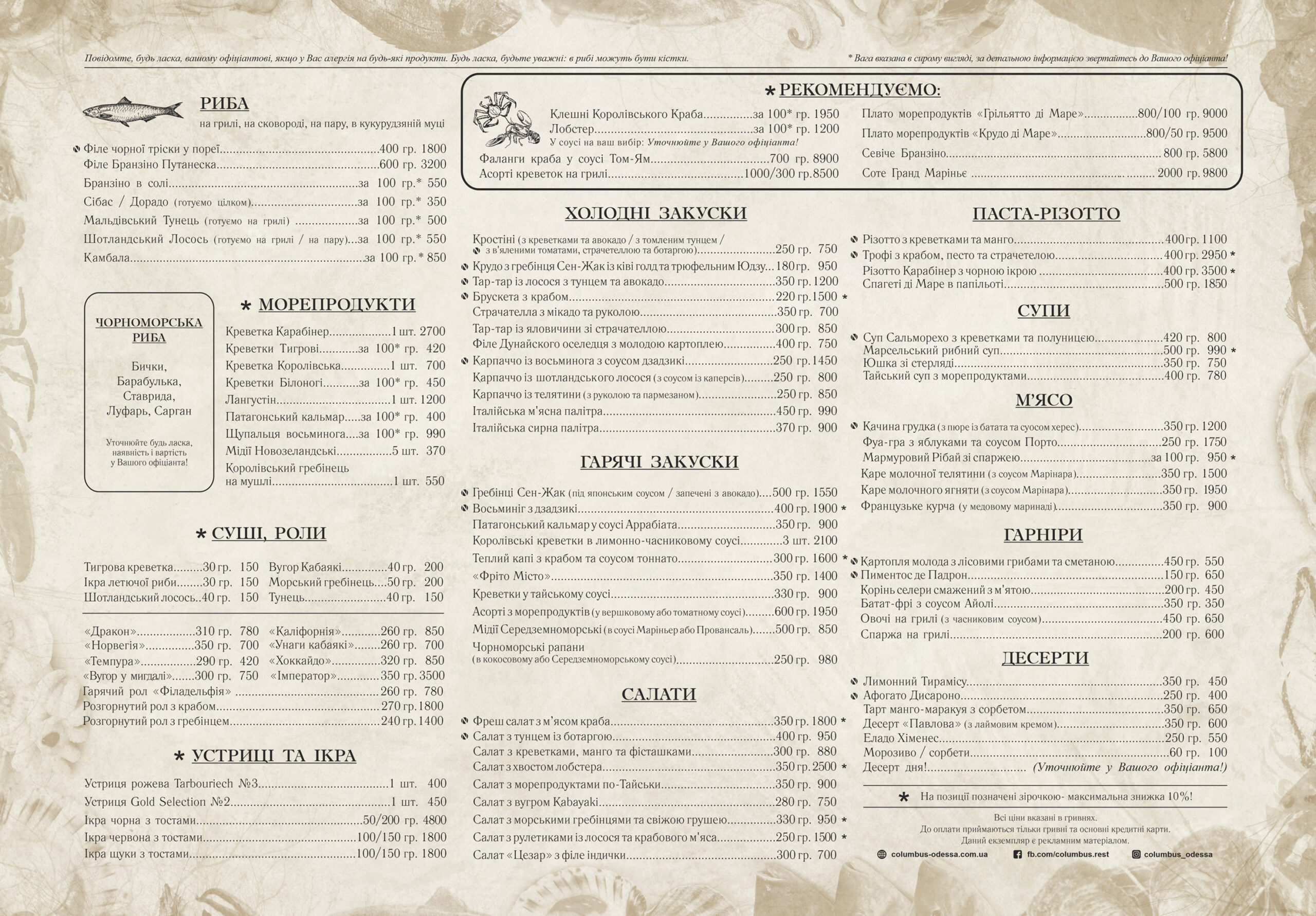 Основа меню Columbus fish-club - риба і морепродукти, проте від сезону до сезону меню змінюється: до риби приєднується м'ясо, страви, приготовані на мангалі, холодні і гарячі закуски, десерти. Те ж саме можна сказати і про приналежність кухні ресторану до будь-якої території або країні. Так, це в основному морська кухня, однак море займає більшу частину планети, і шеф-кухар має величезне поле для діяльності, досить стильно змішуючи в одному меню страви середземноморської, японської, тайської, скандинавської кухонь.