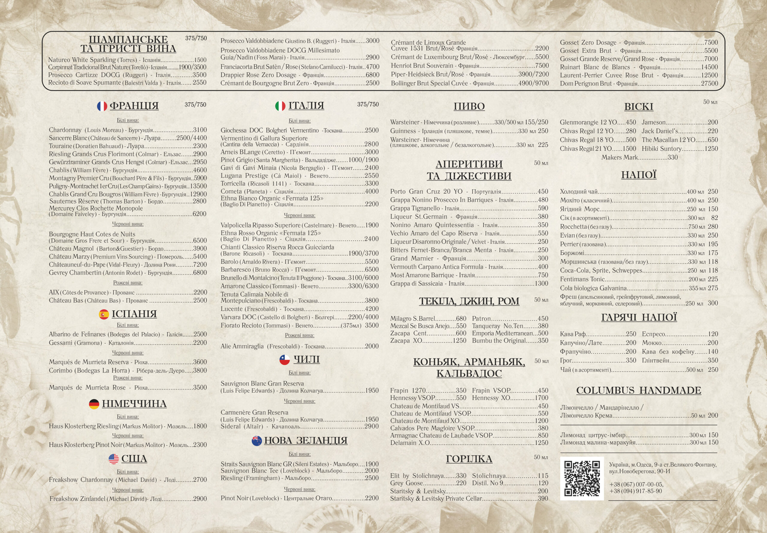 Пам'ятаючи слова Ван Гога про те, що «Найскладніше бути простим» і як істинний адепт ідей великого Бокюза, на чільне місце в Колумбусі ставлять свіжість і сезонність продуктів, з яких створює складні по виду, але досить прості за складом страви. «Особливість кухні" Колумбус "в тому, щоб готувати з простих, свіжих і якісних продуктів зрозумілу їжу. Нам подобається, коли блюдо лаконічно, але ви можете знайти в ньому нескінченно багатий букет смаків, ароматів і отримати естетичне задоволення, навіть просто дивлячись на нього ».